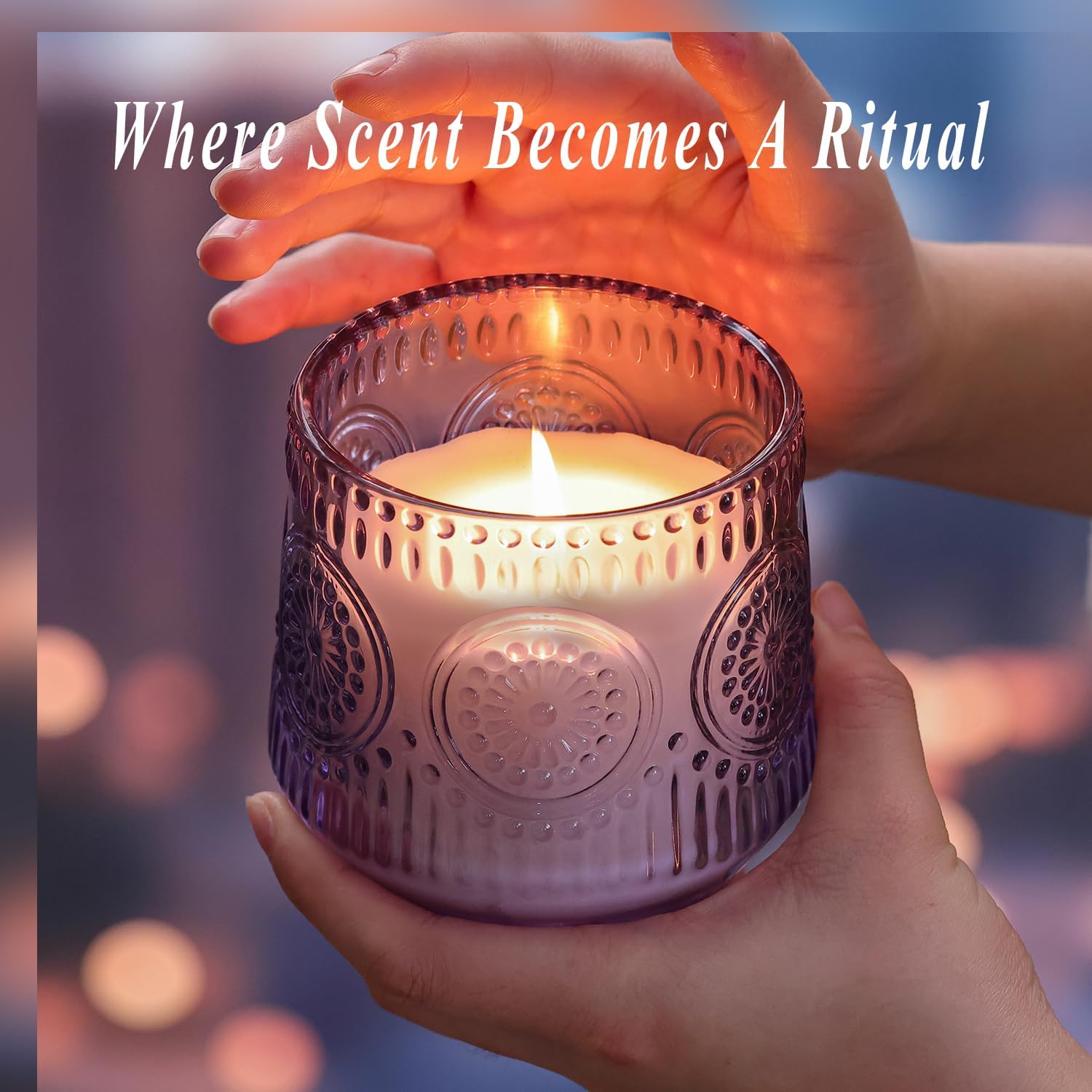 【Elegant Appearance】Housed in beautifully embossed glass jars with wooden lids, these jar candles double as stylish home décor. The soft green and gentle purple tones complement modern, minimalist, and natural home decor styles.