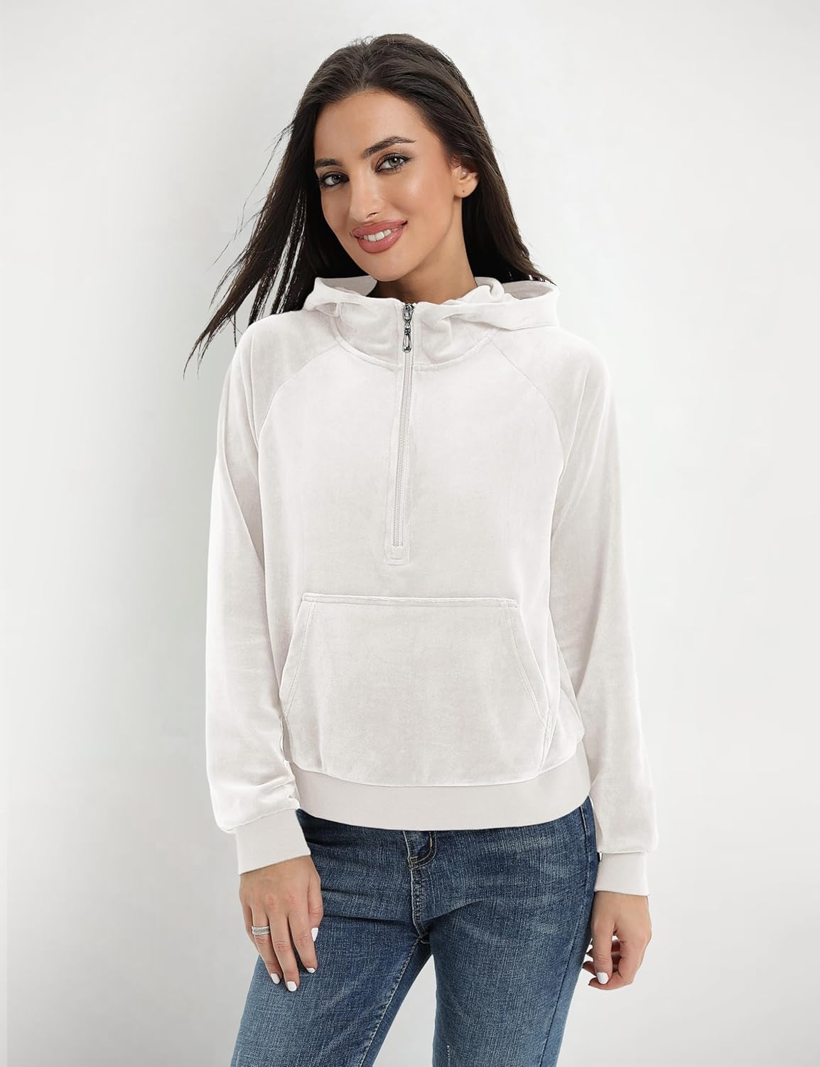 8 reviews for YUCOLEN Women’s Cropped Hoodie Velour Half Zip Sweatshirt with Pocket Long Sleeve Fleece Pullover Cozy Casual Clothes